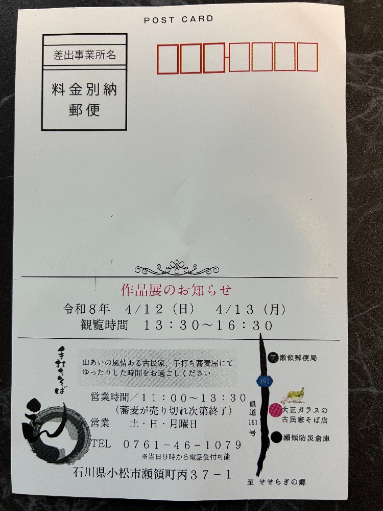 | その他 | 当アトリエは、レッスンと制作業務をメインにしており レッスン中などはお客様には満足な対応ができない場合もございますがお気軽にお声をお掛けください。 |